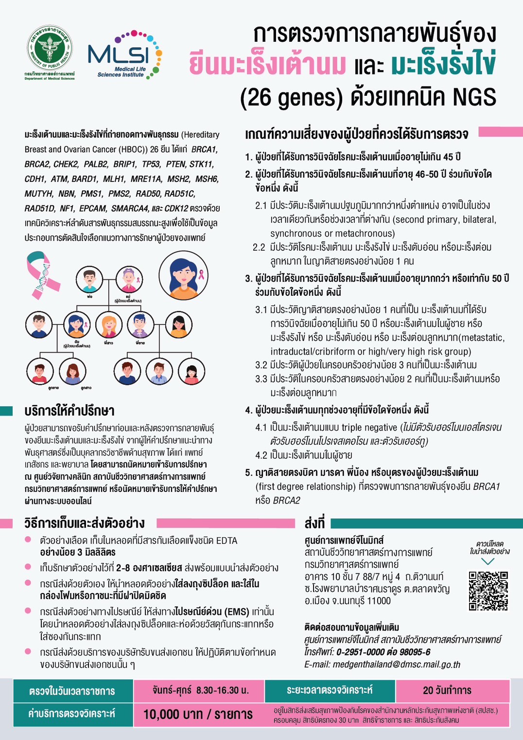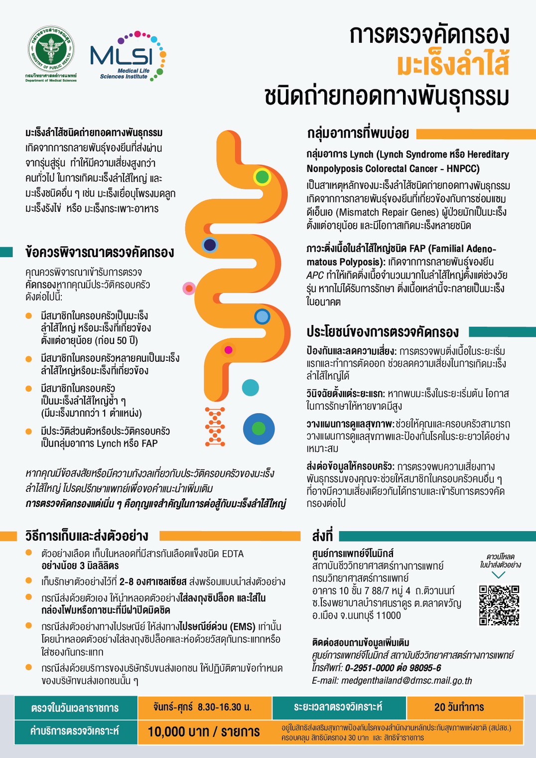 ปัจจุบันสามารถตรวจยีนมะเร็งลำไส้ชนิดถ่ายทอดทางพันธุกรรมได้แล้ว ช่วยคัดกรองแต่เนิ่นๆ โดยสามารถสอบถามข้อมูลได้ที่ ศูนย์การแพทย์จีโนมิกส์ สถาบันชีววิทยาศาสตร์การแพทย์ กรมวิทยาศาสตร์การแพทย์ กระทรวงสาธารณสุข โทรศัพท์ 0-2951-0000 ต่อ 98095-6