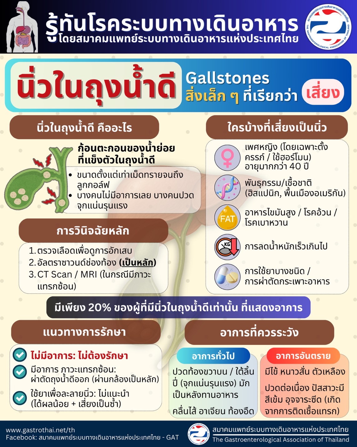 ผู้ป่วยที่เป็นนิ่วในถุงน้ำดี แม้จะไม่แสดงอาการ อาจตรวจพบตอนไปตรวจรักษาโรคอื่น แพทย์จะแนะนำให้รับการผ่าตัด เพราะหากปล่อยทิ้งไว้ อาจมีการอักเสบและมีโรคแทรกซ้อนตามมาก็ได้ ที่สำคัญโรคนี้ป้องกันได้ด้วยการ “ลดกินอาหารที่มีไขมัน และการออกกำลังกายเป็นประจำ” ดังนั้นการป้องกันทำได้โดยการปรับพฤติกรรมการกิน ลดน้ำหนัก และออกกำลังกายอย่างสม่ำเสมอ และไม่ลืมตรวจสุขภาพเป็นประจำจะช่วยให้ตรวจพบความผิดปกติได้ไวขึ้น แม้ไม่มีอาการใดๆ หากมีปัจจัยเสี่ยง ควรปรึกษาแพทย์เพื่อรับคำแนะนำในการป้องกันและรักษาอย่างถูกต้อง