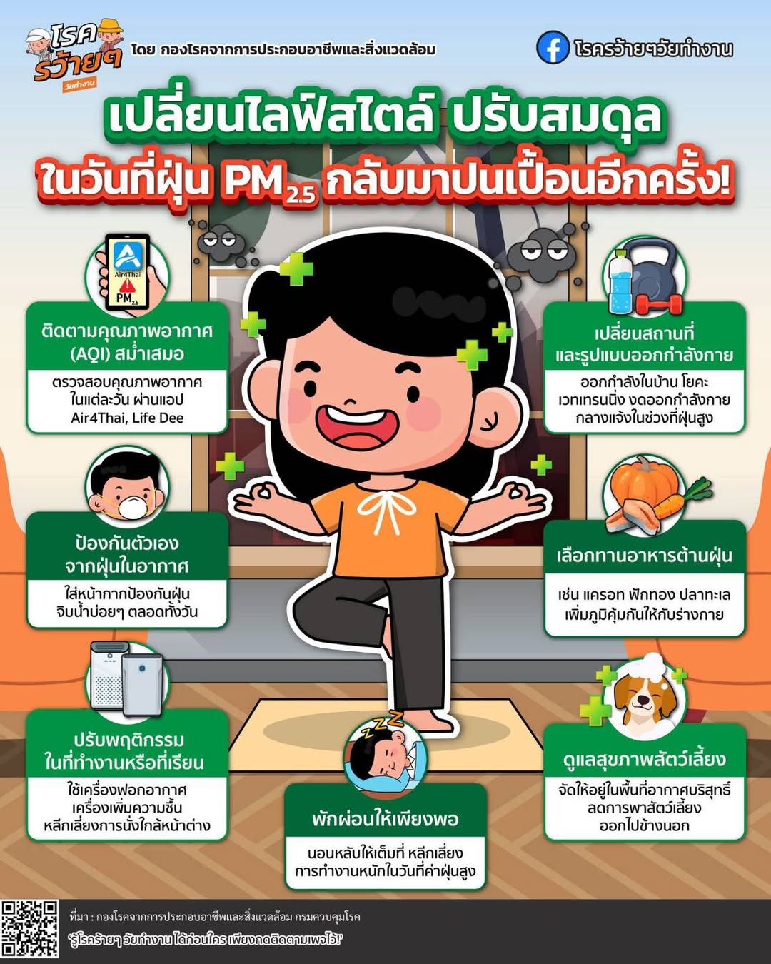 ไม่ลืมการพักผ่อนให้เพียงพอ เพราะการพักผ่อนที่ดีจะช่วยให้ร่างกายสามารถฟื้นฟูและรับมือกับมลภาวะต่างๆ ได้ดีขึ้น ดังนั้นควรหลีกเลี่ยงการทำงานหนักหรือกิจกรรมที่ใช้พลังงานมากในวันที่มีค่าฝุ่นสูง และนอนหลับพักผ่อนให้เพียงพอ
