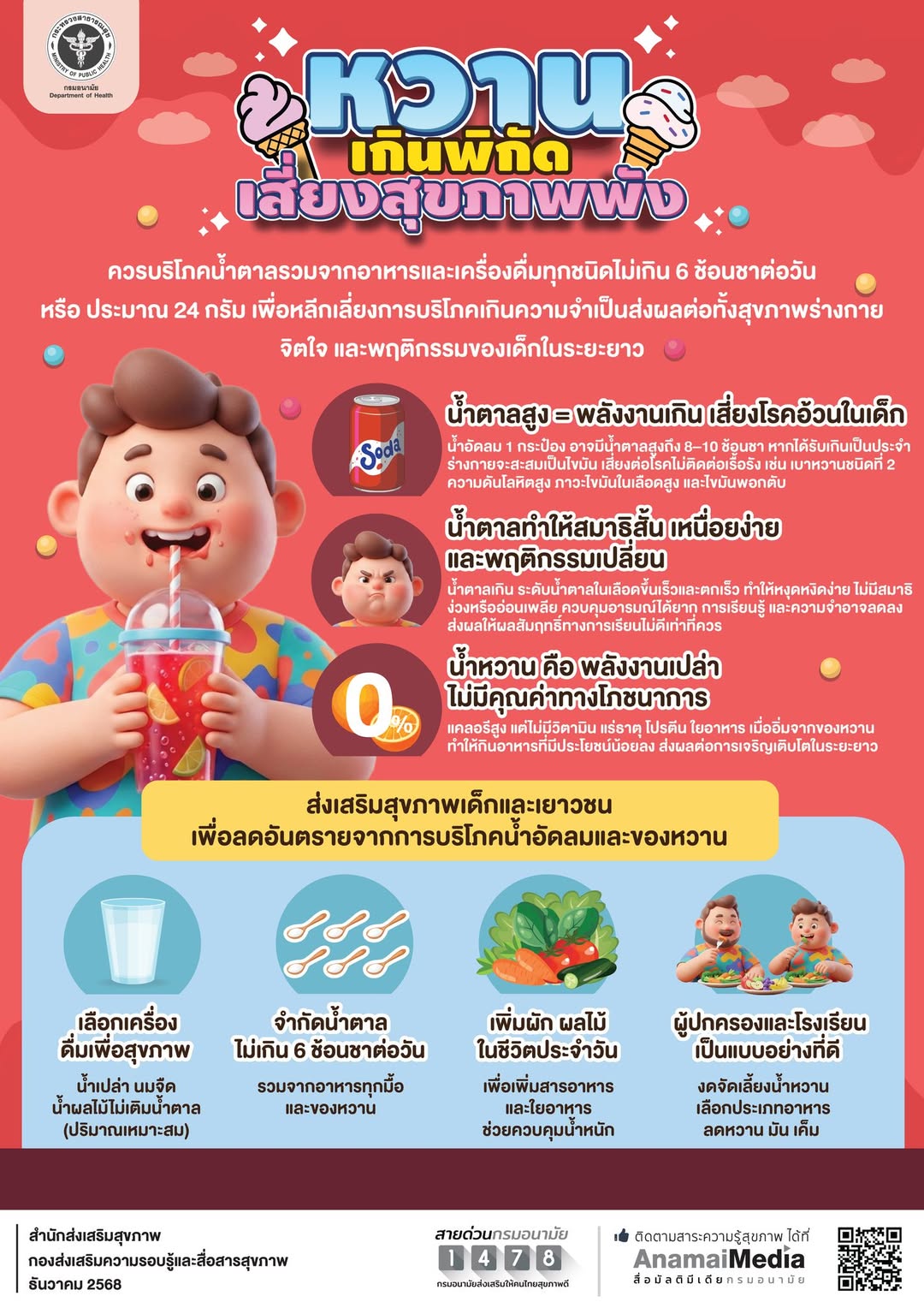 เมื่อหวานเกิน ไร้ประโยชน์แถมมีโทษ ดังนั้น ทั้งเด็กและผู้ใหญ่จำเป็นต้องเริ่มต้นปรับพฤติกรรมตั้งแต่วันนี้ โดยเลือกดื่มเพื่อสุขภาพ เน้นน้ำเปล่า นมจืด หรือน้ำผลไม้ไม่เติมน้ำตาล จำกัดน้ำตาลรวมทุกมื้อไม่เกิน 6 ช้อนชา/วัน และเพิ่มผักผลไม้ เพื่อเพิ่มวิตามินและใยอาหาร ช่วยควบคุมน้ำหนัก