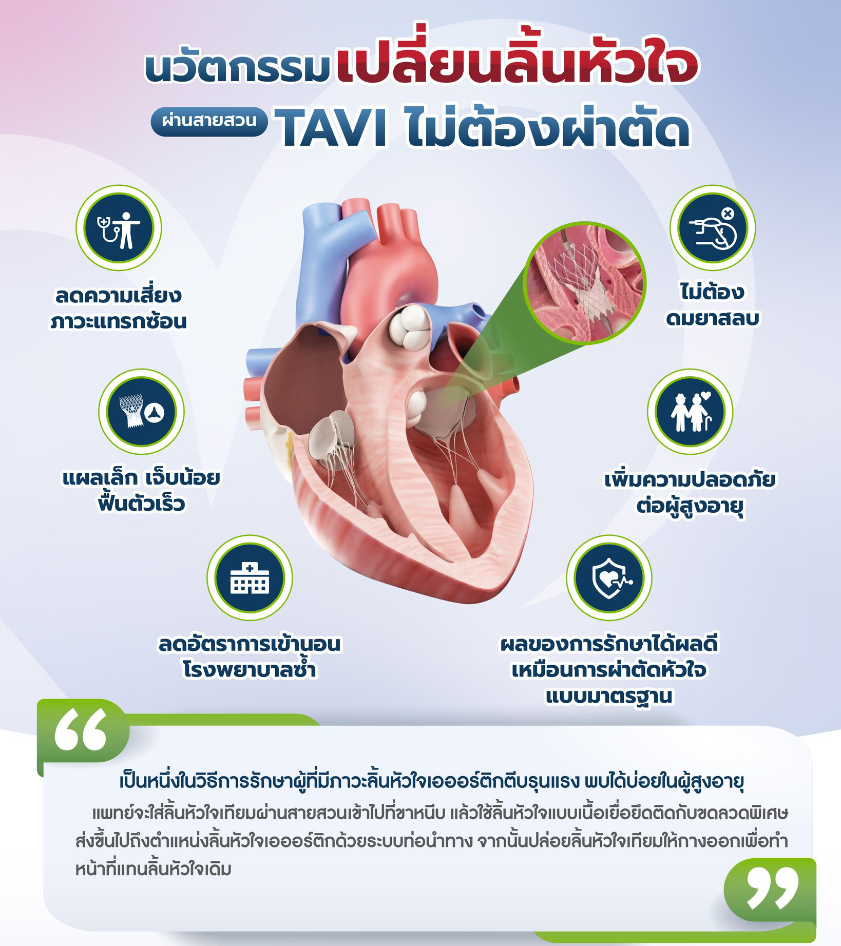 หลายคนอาจไม่ทราบว่า อาการเหนื่อยง่ายผิดปกติ หรือความรู้สึกอึดอัดเมื่อนอนราบ อาจเป็นสัญญาณเตือนของ “โรคลิ้นหัวใจ” ภัยเงียบที่ค่อยๆ ทำลายหัวใจโดยไม่รู้ตัว กว่าจะสังเกตเห็นความผิดปกติ อาการก็มักรุนแรงจนต้องรักษาด้วยการผ่าตัดเปิดหน้าอก ซึ่งมีความเสี่ยงและต้องใช้เวลาพักฟื้นนาน สร้างความกังวลให้ผู้ป่วยไม่น้อย อย่างไรก็ตาม ปัจจุบันมีทางเลือกการรักษารูปแบบใหม่ด้วยเทคโนโลยี Transcatheter Aortic Valve Implantation (TAVI) ที่ไม่ต้องผ่าตัดเปิดหน้าอก ช่วยลดความเสี่ยง ฟื้นตัวได้ไว และเป็นอีกทางเลือกสำหรับผู้ป่วยที่มีภาวะรุนแรง ขณะเดียวกัน การป้องกันและตรวจพบโรคตั้งแต่ระยะเริ่มต้นยังคงเป็นสิ่งสำคัญ