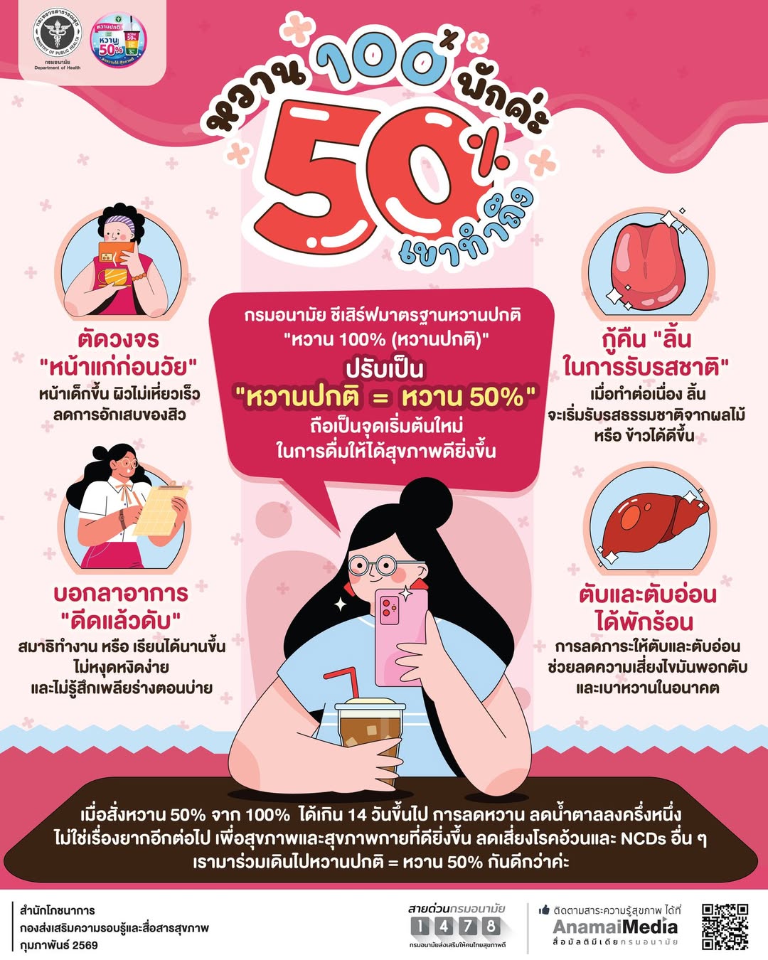 กรมอนามัยรณรงค์ลดหวานต่อเนื่อง สร้างมาตรฐานความหวานใหม่ “หวานปกติ = หวาน 50%” สตาร์ทดื่มให้ได้สุขภาพดียิ่งขึ้น เพื่อลดเสี่ยงน้ำหนักเกินและโรค NCDs นอกจากนี้ การลดความหวานยังช่วยสุขภาพในเรื่องอื่นๆ มากมายด้วยฃ